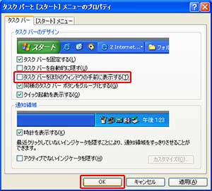 5.「タスクバーをほかのウィンドウの手前に表示する」のチェックをはずし、OKをクリック